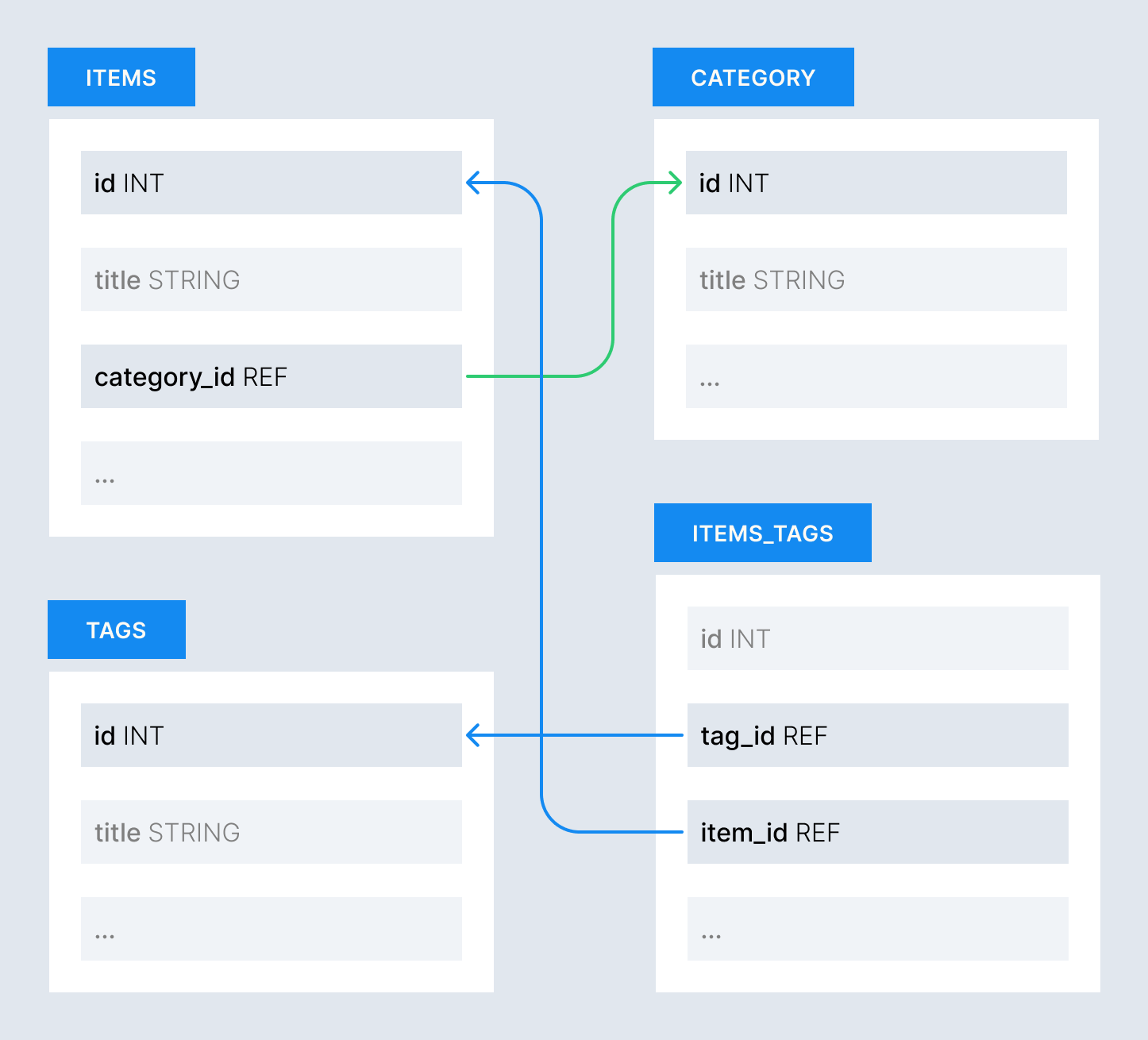 Поля, указывающие на другие сущности через внешние ключи. Главное их отличие от нормализованных словарей в том, что ссылочные поля связывают сущности между собой и с другими объектами (например, с терминами таксономий). Тогда как значения ENUM из предыдущего примера не являются отдельными объектами, они просто строчка в фиксированном списке.