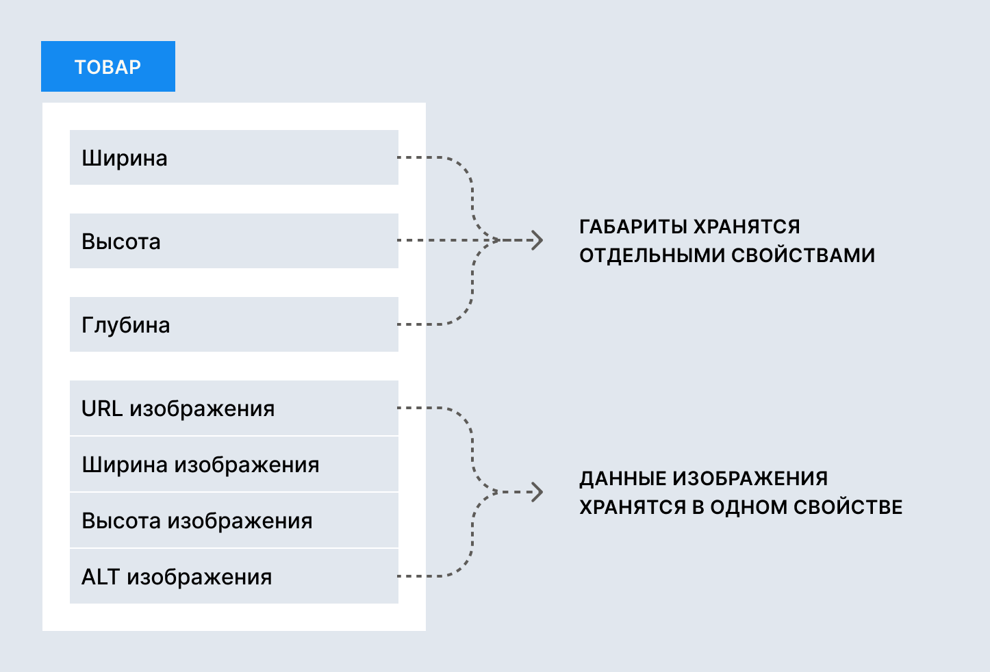 Когда у сущности много разнородных характеристик (например, у товара есть изображения, материалы, дополнительные свойства) — удобнее собрать их в «пакеты». То есть не разбивать свойство на десятки отдельных полей, а объединить в один структурированный набор. Это помогает избежать перегруженности данных и сделать архитектуру более гибкой.