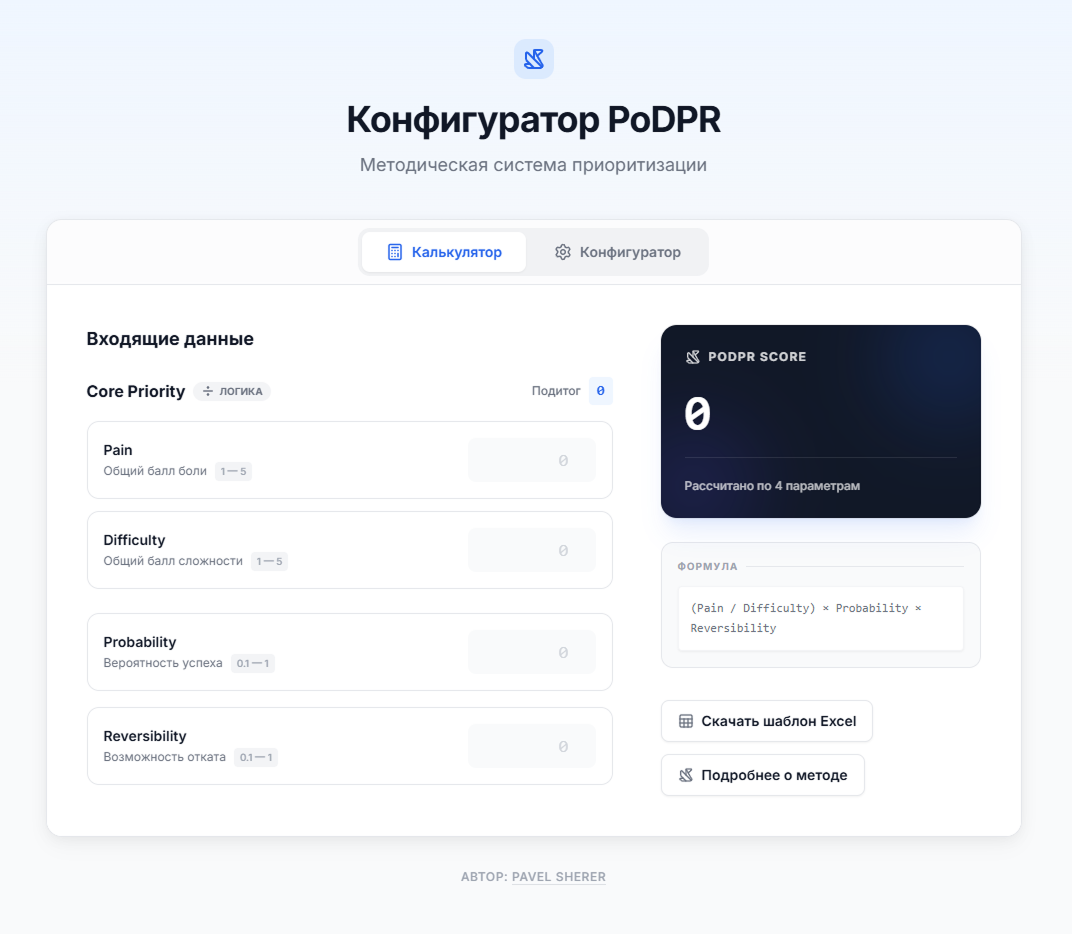 Простое веб-приложение, позволяющее настраивать формулу приоритизации PoDPR. Работает полностью в браузере, без вычислений на сервере.